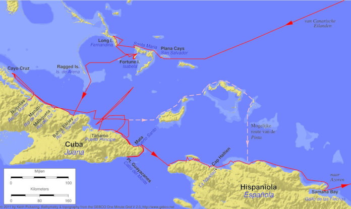 - De tweede reis van Columbus die plaats vond tussen 1493 en 1496. Author – Keithpickering~commonswiki, license CC BY-SA 3.0