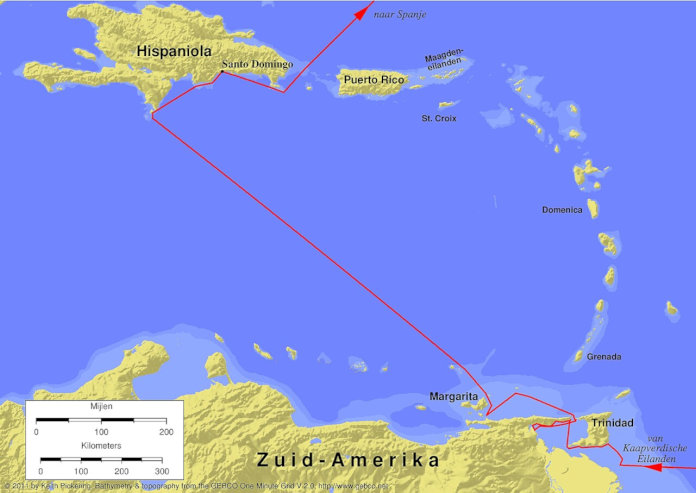 - Kaart van de derde reis van Christoffel Columbus, 1498-1500. Author – Keithpickering~commonswiki, license CC BY-SA 3.0
