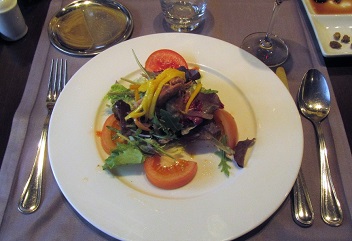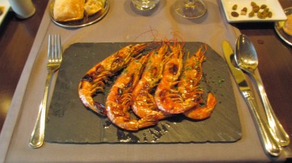 Dit menu hieronder bestaat uit Perdiz con Mango (patrijs met mango) / Langostines a la plancha (gambas Gegrilleerd / Tarta de Calabaza (pompoentaartje).