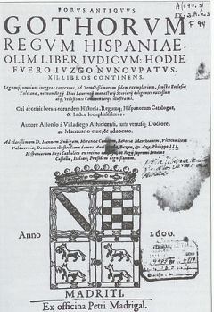 - De omslag van de Liber Iudiciorum (1600 editie). Source – Pérez Bustamante, Rogelio, Historia del Derecho Español, Dykinson, 1994 Descripción = Portada de una edición del año 1600, en Madrid, license Public Domain