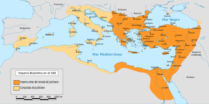 - Het Byzantijnse Rijk op zijn hoogtepunt onder Justinianus I. Author – Neuceuderivative work: Rowanwindwhistler, license CC BY-SA 3.0 (I (Coralma*), added the Dutch text in the box.)
