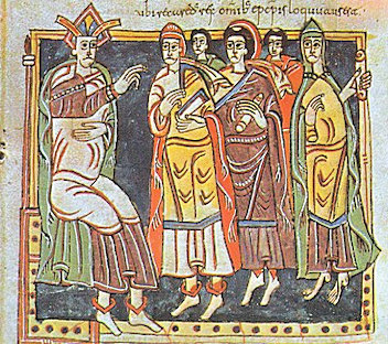 - Aula Regia. Predikanten en leken van Hispano-Visigoten wonen een bijeenkomst bij in Visigoth Toledo. Codex Vigilanus. Author – Unknown, license Public Domain