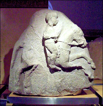 - Een ruiter, van zijn paard gesprongen, die zijn vijand doorboort, Iberisch beeldhouwwerk uit de 5e eeuw v. Chr., Porcuna, Jaén. Author – Ángel M. Felicísimo, license CC BY-SA 4.0.