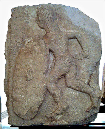 Hoogreliëf met een Auletris (vrouw die een aulos bespeelt). Oud Iberisch kunstwerk uit kalksteen, gemaakt aan het einde van de 3e of het begin van de 2e eeuw v.Chr. Het maakt deel uit van de zogenaamde Sculpturen van Osuna, provincie Sevilla, Andalucía.