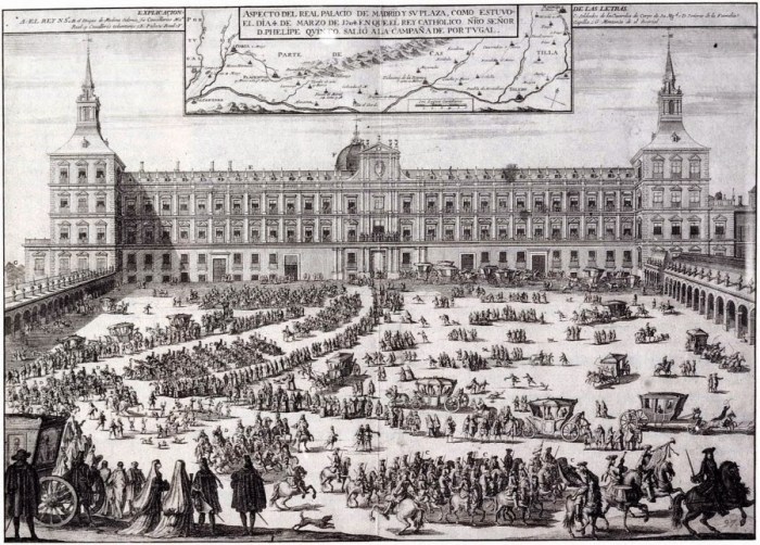 Een prent van het oude Alcazar van Madrid dat in 1734 met op de voorgrond velen van het Hof van Felipe V.