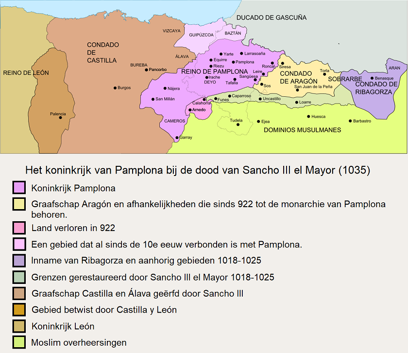 - Het koninkrijk van Pamplona bij de dood van Sancho III el Mayor (1035). Author – Miguillen, license CC BY-SA 4.0