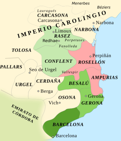 Een kaartje waarop de Catalaanse graafschappen te zien zijn.