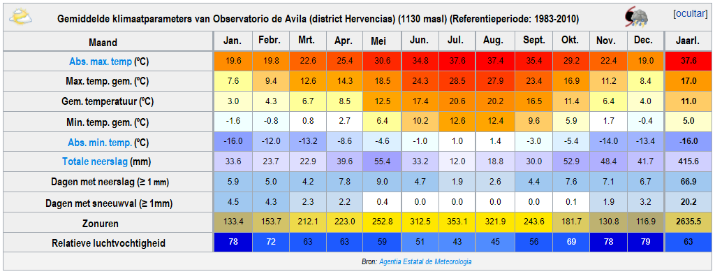 - Het gebied ten zuiden van het Centrale Systeem dat het Ávilaanse deel van de vallei van Tiétar omvat, wordt gekenmerkt door zijn lagere hoogte en warmere klimaat. In dit deel vindt u ook sinaasappel-, olijf- en palmbomen te vinden in de belangrijkste dorpen. Tot de belangrijkste gemeenten in dit gebied behoren Arenas de San Pedro, Candeleda, Sotillo de la Adrada, Mombeltrán en Lanzahíta.
