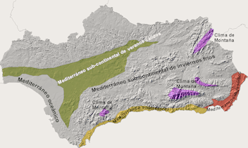 Andalucía bevindt zich volledig binnen het domein van het Mediterrane klimaat, gekenmerkt door een overwicht aan zomerse hogedrukgebieden in de zomers, de hogedrukzone van de Azoren, met als gevolg typische droge zomers, af en toe onderbroken door zware regenbuien en tropische temperaturen. In de winter, verplaatsen de tropische hogedrukgebieden zich naar het zuiden en laat het polaire front binnendringen in Andalucía. De instabiliteit neemt toe en zo ook de periodes van regenval. Deze concentreren zich in de herfst, winter en lente. De temperaturen zijn zacht.