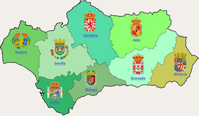 - Provincies van Andalucía. Auhor – Asqueladd, licence CC BY-SA 3.0 (I, Coralma* have added the coats of arms of the provinces and the name of the provinces to this map and placed it on Wikipedia Commons under the same licence).