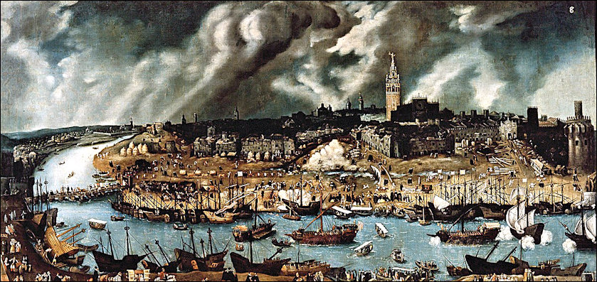 - De haven van Indias (zo werd toendertijd Amerika genoemd),,,,. Author – Alonso Sánchez Coello (1531–1588) , license Public Domain