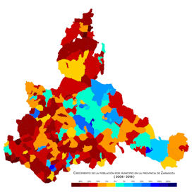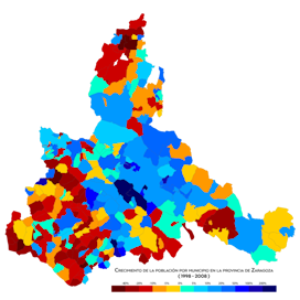 - Bevolkingsgroei per gemeente in de provincie Zaragoza tussen 1998 en 2008. Author – Lanoyta, license CC BY-SA 4.0