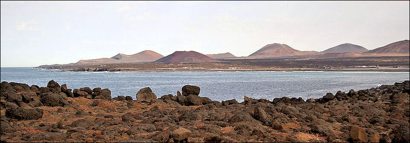 Uitzicht vanaf de zuidwestelijke kust van Lanzarote in noordoostelijke richting. Op de foto is vooral een reeks sintelkegels te zien in het gebied tussen El Golfo en Yaiza.