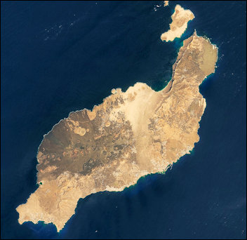 Satellietfoto van Lanzarote dat het dichtst bij het Afrikaanse vasteland ligt. Het is ook een van de droogste en meest kale eilanden, met een ruig terrein dat ruimtevaartorganisaties ertoe heeft aangezet om er te trainen.