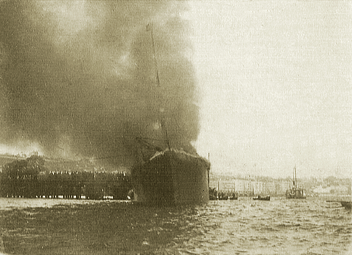 - Brand op de Cape Machichaco, afgemeerd aan de kade in 1893. Author – Unknown, license Publiek Domein