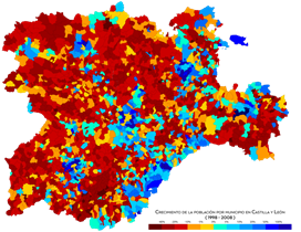 - Bevolkingsgroei per gemeente in de comunidad autónoma van Castilla y León tussen 1998 en 2008. Author – Lanoyta, license CC BY-SA 4.0