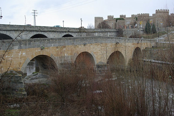 De oude Romeinse brug over de rivier de Adaja, met op de achtergrond de Romeinse muren van Ávila.