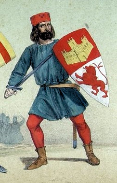 Op het eerste deel, op een zilveren veld, een half koningslichaam, gekroond in goud met een open kroon, gezicht van vlees en met een dalmatiek (gewaad) van keel beladen met drie gouden kastelen; brisure (of schildzoom) van keel beladen met zestien gouden kastelen; - Op het tweede deel (links, dit wordt altijd bekeken vanuit de drager van het schild), van keel, een kasteel van goud, metselwerk van sabel, met open deur en ramen.