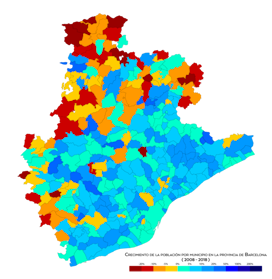 - Bevolkingsgroei per gemeente in de provincie Barcelona tussen 2008 en 2018. Author – Lanoyta, license CC BY-SA 4.0