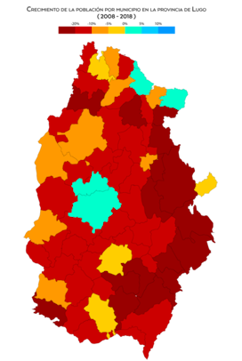 De bevolking van de provincie Lugo daalt gestaag sinds de jaren ’40 van de vorige eeuw. Dit is vooral te danken aan de lage vruchtbaarheid van de landbouwgronden, maar ook door de migratie naar de aan de Atlantische kust gelegen provincies van Galicia en andere provincies in Spanje. Ook Zuid-Amerikaanse landen als Argentinië en Uruguay waren erg populair. De laatste paar jaar vindt er echter weer een kentering plaats en groeit het aantal inwoners van de provincie weer. Er wordt door de regering en de plaatselijke besturen veel aan gedaan om de mensen terug naar de dorpen te lokken. Dat gaat slechts met mondjes maat daar het nog steeds ontbreekt aan infrastructuur en industrie.