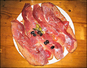 - Pa amb oli, typisch Mallorcaans, hier betreft het een bord met Jamón serrano. Author – Rafael Ortega Diaz, license CC BY-SA 3.0