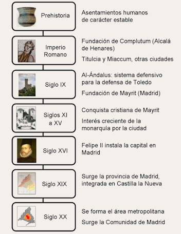De geschiedenis van de Comunidad van Madrid is dus zeer recent. Bestuurlijk laat de provincie zich pas in de 19e eeuw, en de late 20e eeuw van zich horen als de autonome provincie vorm begint te krijgen. Er zijn echter een aantal oude historische mijlpalen die doorslaggevend waren voor het bepalen van het huidige profiel van de regio: