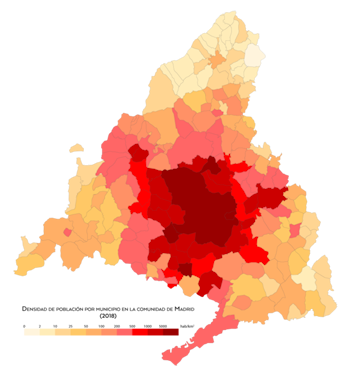 - Bevolkingsdichtheid per gemeente in de Comunidad de Madrid in 2018. Author – Lanoyta, license CC BY-SA 4.0