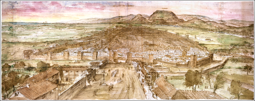 - Tekening van een algemeen aanzicht van Alcalá de Henares,,,,. Author – Anton van den Wyngaerde (1525–1571), license Public Domain