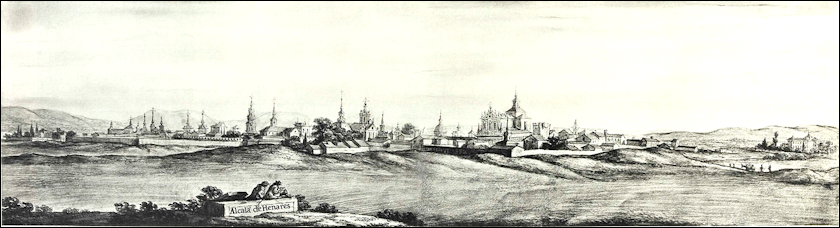 - Panoramisch uitzicht op Alcalá de Henares in 1687,,,,. Author – Johann Friedrich Leonart (1633–1687) , license Public Domain