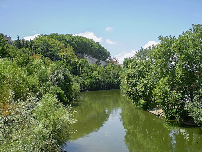 - De rivier Arga stroomt door Pamplona met de stad op de achtergrond. Author – Miguillen, license CC BY 3.0