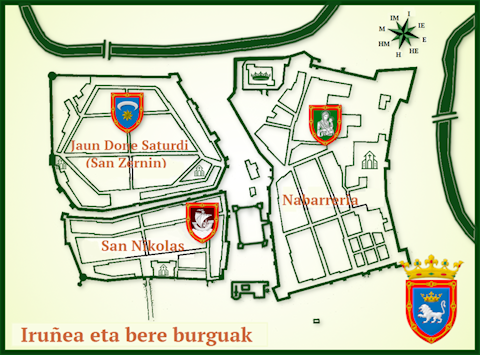 La Navarrería (zie tekening boven: Pamplona y sus tres burgos), gelegen in het oorspronkelijke gebied van de stad, werd voornamelijk bewoond door boeren; San Cernin in het westen van de stad, waar de Franken uit het Franse zuiden zich vestigden; en San Nicolás, dat in de 12e eeuw ontstond rond een nieuwe parochie die werd gebouwd door Franken, allemaal met hun eigen bestuur en privileges, op grond die aanvankelijk was afgestaan door de bisschop.
