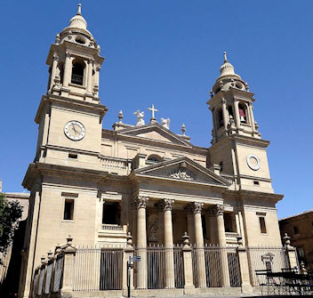de Santa María. Het bevindt zich in La Navarrería, het hoogste en oudste punt van de stad. Van onbekende oorsprong was het vanaf 1023 de bisschoppelijke zetel en begon men met de verbouwing, die in 1100 werd voltooid en in 1124 werd ingewijd. Nadat de kathedraal in 1300 tot ruïne was verklaard, begon men met de wederopbouw dankzij de impulsen van Karel III, koning van Navarra, en kardinaal Martín de Zalba, de plaatselijke bisschop. De kathedraal onderscheidt zich door haar artistieke waarde, aangezien zij wordt beschouwd als het belangrijkste gotische monumentale complex van Navarra. In de noordelijke toren hangen drie 16e-eeuwse klokken; het gietstuk van de grootste van deze klokken, de Mariaklok, dateert van 1584 en wordt alleen geluid in omstandigheden van speciale plechtigheid. Binnenin de kerk is er een grote eenheid van stijl binnen de gotische stijl. Het heeft een plattegrond in Latijns kruisvorm met een middenschip van twee geledingen en een dwarsschip van dezelfde hoogte, twee zijschepen, kooromgang en zijkapellen, alle met eenvoudige ribgewelven. In het presbyterium, onder een modern gotisch baldakijn, staat het beeld van Santa María la Real, een in zilver geplatteerd Romaans beeld, waarvoor de koningen van Navarra hun ambtseed zwoeren. In het midden van het middenschip bevindt zich het mausoleum van de koningen van Navarra, Karel III en zijn vrouw Leonor.
