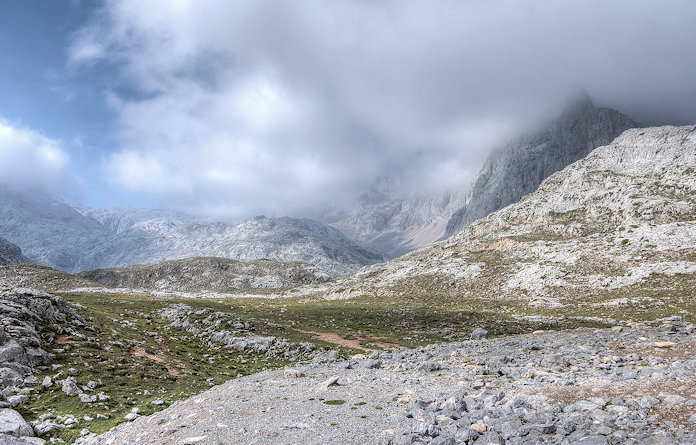 Ten noorden van Peña Vieja, waar we de zogenaamde cuetos de San Juan de la Cuadra oversteken om Asturisch grondgebied binnen te gaan, bereiken we de Moñetas vallei, verlaten we de Urriellu berggroep in het westen en bereiken we het pittoreske Moñetas meer op weg naar de vruchtbare vlakten van Sotres (oostelijke grens van de Urrieles).