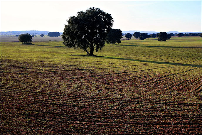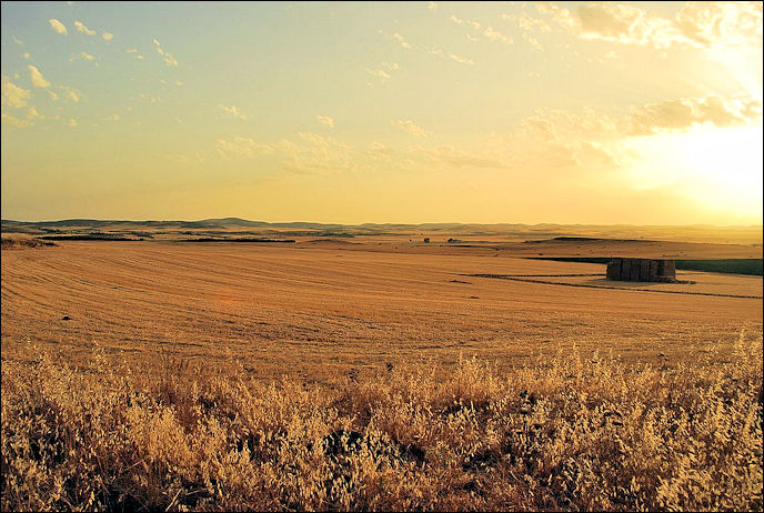 - De zon komt net over de horizon van het vlakke land van La-Mancha. Author – M.Peinado, license CC BY 2.0