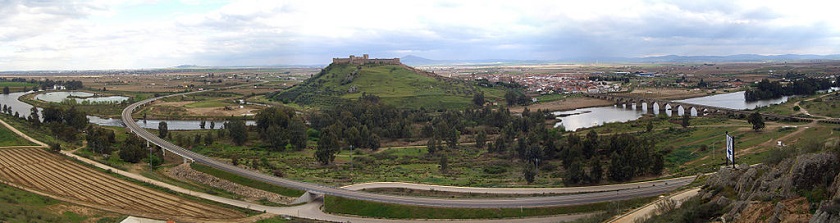 Panoramisch zicht op Medelín, met in het midden het kasteel en rechts de oude 17e eeuwse brug met 20 bogen.