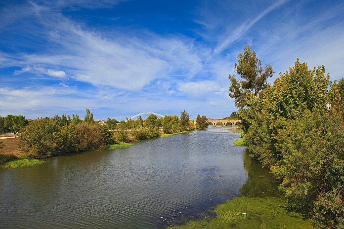 Op de zuidelijke grens van de twee gebieden ligt de brug van Ayuda, die de Spaanse stad Olivenza en de Portugese stad Elvas met elkaar verbond. Het werd in 1509 gebouwd door de Portugese koning Manuel I en gedeeltelijk afgebroken in 1709, tijdens de Spaanse Successieoorlog. Vervolgens stroomt ze langs het Portugese district Évora, waar zij de grens met Spanje blijft markeren. Zij passeert de Portugese stad Juromenha en, steeds rechtlijniger in een verticale noord-zuidrichting, komt zij definitief op Portugees grondgebied terecht. De droogte van dit gebied heeft geleid tot de bouw van diverse stuwdammen ten behoeve van irrigatie, die de natuur (voornamelijk vrij zeldzame vogels) niet ten goede komt. Ondanks protesten van natuurliefhebbers en verenigingen gaat de bouw van stuwdammen door. Zo zien we dat begin 2002 het enorme stuwmeer van Alqueva nabij Moura en Reguengos ingebruik wordt genomen, dat met een oppervlakte van 250 km² wordt beschouwd als het grootste van Europa. Het stuwmeer heeft een totale lengte van 83 km en de oever omspant een lengte van 1160 km. Vlakbij liggen de steden Mourão .