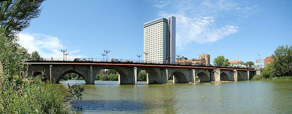 - De Pisuerga als zij door Valladolid stroomt, met op de achtergrond de Puente Mayor,,,,. Author – Magnus Colossus~commonswiki, licence CC BY-SA 3.0